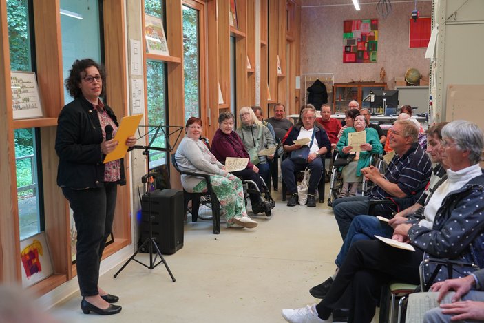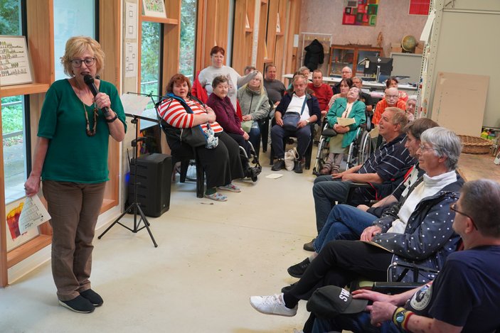 Ana Isabel Fernández Furelos leitete danach über zum jüngsten kreativen Projekt der Kreativen Werkstatt. Seit fast zwei Jahren traf und trifft sich ein halbes Dutzend Künstlerinnen und Künstler einmal wöchentlich in einer Theatergruppe. Menschen, die oft große Schwierigkeiten in der verbalen Kommunikation haben, beweisen so, dass man mit Körpersprache und Theater Emotionalität auf eigene Art darstellen kann. Die Theatergruppe zeigte, wie sie mit Mimik und Gestik und knappen Kommentaren Schlagworte wie Stressabbau, Trauer, Misserfolg, Angst, Spaß, Liebe oder Körperkontakt szenisch interpretieren. Großer Applaus zeigte: Das kam gut an.