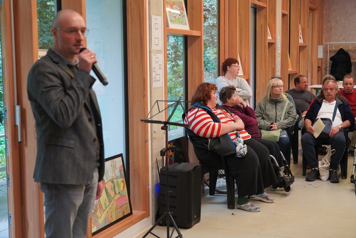 Matthias Waldmann, Verbundleitung Teilhabe Nordost Brandenburg, erinnerte in seinem Grußwort an die preisgekrönten Leistungen solcher Künstler der Kreative Werkstatt wie Ilse Berner. Er verwies auf Bundes- und Europäische Kunstpreise, die an Lobetaler Künstler gingen, und auf die Aufmerksamkeit, die das in der Öffentlichkeit gefunden habe: „Hier ist es eindrucksvoll gelungen, Kunst von Menschen für Menschen sichtbar zu machen.“