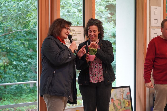 Sabine Krillmann, Teamleitung Beschäftigung und Bildung Blütenberg/Eberswalde, dankte Ana Fernández Furelos für ihre engagierte Arbeit mit einem Blumentopf, in dem zusätzlich zwei Pinsel steckten: „Ein ganz feiner für das sensible Händchen, dass Sie hier an jedem Tag brauchen, und ein ganz breiter für die ebenso wichtige kräftige Grundierung.“