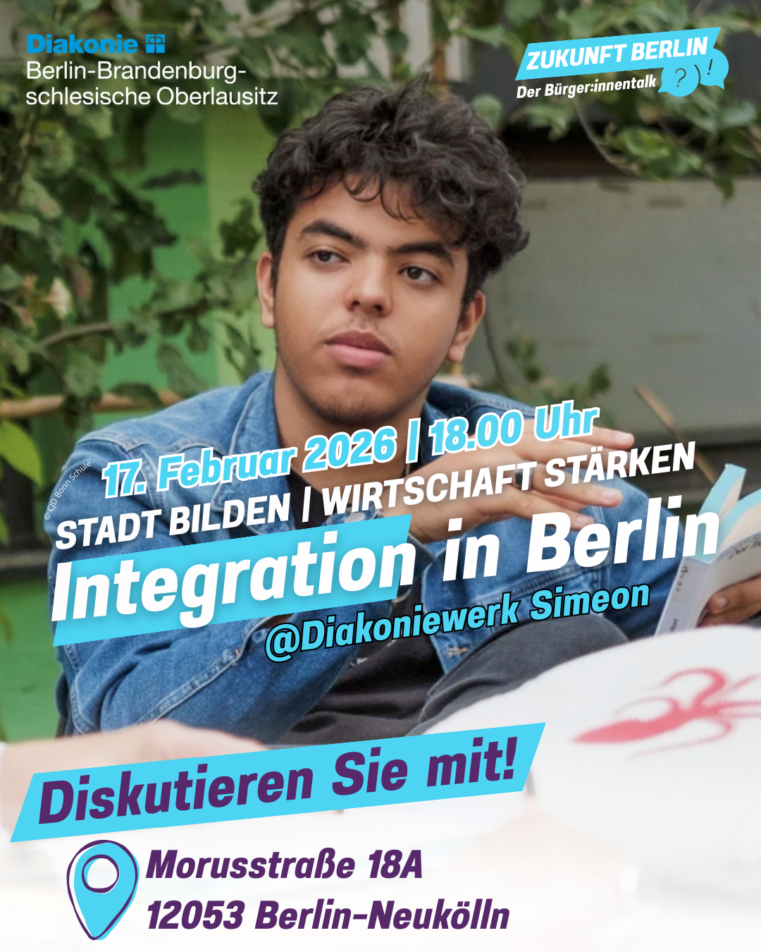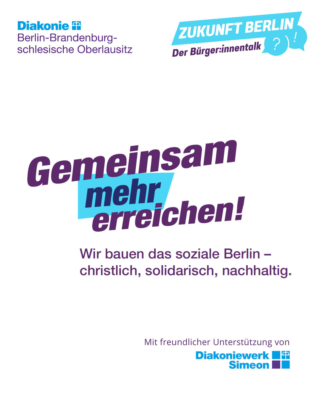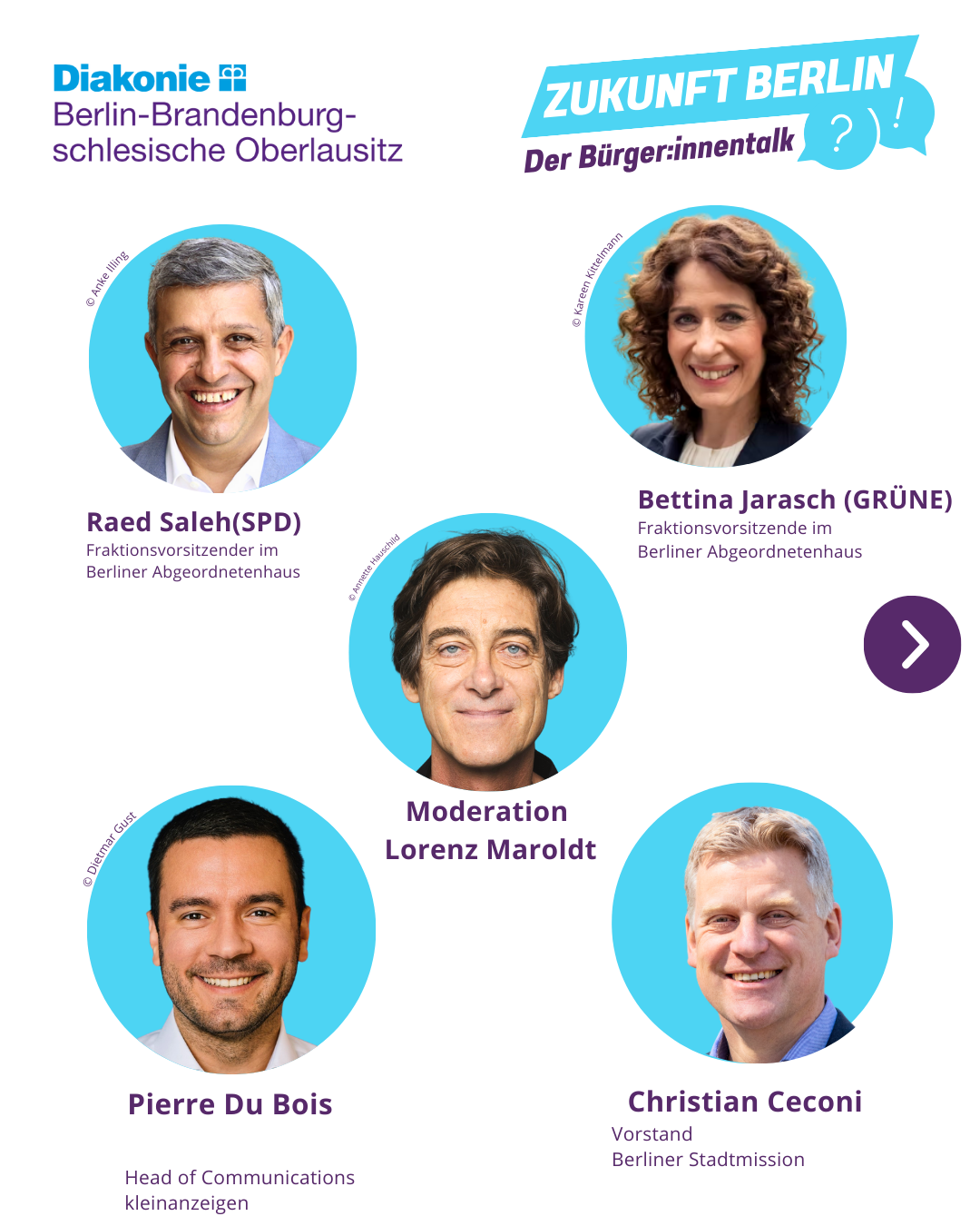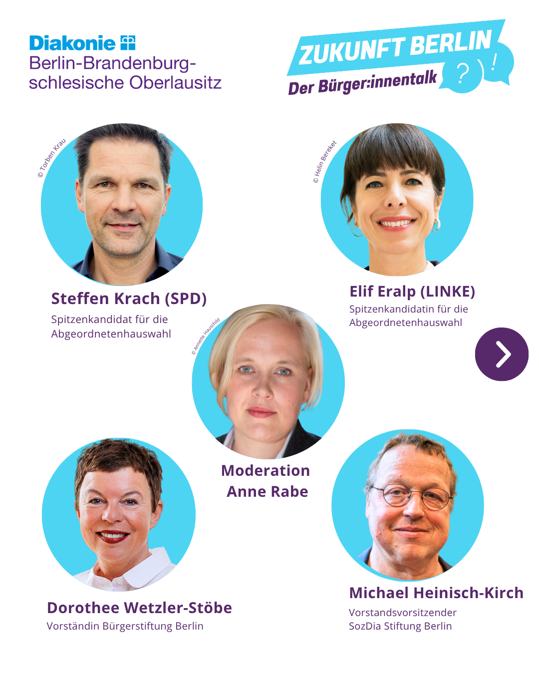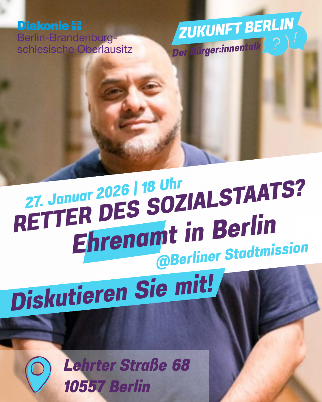 Bis zu den Berliner Abgeordnetenhaus- und Bezirkswahlen 2026 bringt die Diakonie mit der neuen sozialpolitischen Veranstaltungsreihe "Zukunft Berlin | Der Bürger:innentalk" monatlich scheinbar unlösbare gesellschaftliche Herausforderungen auf die Bühne – im Dialog mit engagierten Berliner Bürger:innen, politischen Entscheidungsträger:innen und Fachkräften der sozialen Infrastruktur. Die Veranstaltungen finden in allen Berliner Bezirken statt und greifen jeweils lokal relevante Themen auf - darunter Stadtarmut folgen Pflege, Jugendhilfe, Wohnen und soziales Bauen, Integration, Inklusives Stadtleben, Ehrenamt, Demokratie, Gesundheitsversorgung.